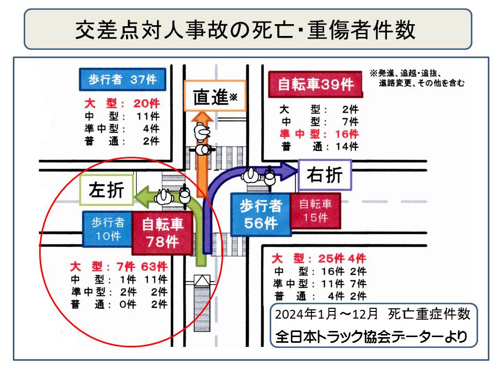 図表4は、全日本トラック協会の対人事故のデータで、2024年の交差点事故の死亡・重傷件数です。協会内の車両における事故件数ですが、車種別や歩行者・自転車別の事故の特徴が反映されています。